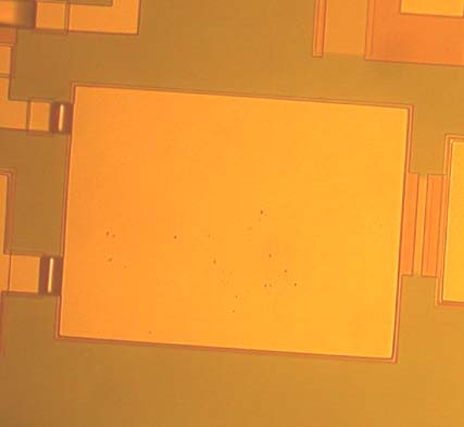 若发现有表面有异常,主要分为两种情况: 一种是,芯片表面存在微小坑点,且上方镀金层颗粒完好无损,如图1。这个属于正常现象。 Hittite的管芯器件满足军用级要求(MIL-STD-883)。在外观检查上,MIL-STD-883 Method 2010有明确的检查标准: No device shall be acceptable that exhibits the following defects in the operating metallization.